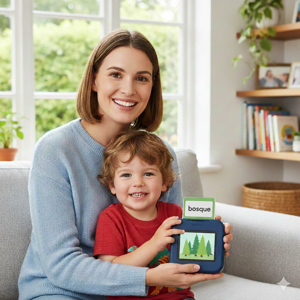 Muy recomendable para familias bilingües. Mis hijos alternan entre español e inglés sin problema gracias a las tarjetas parlantes de Speako.